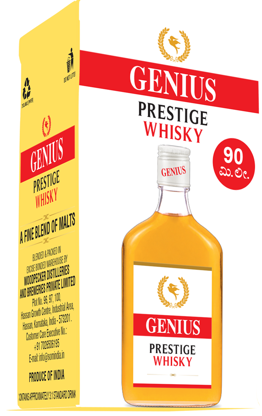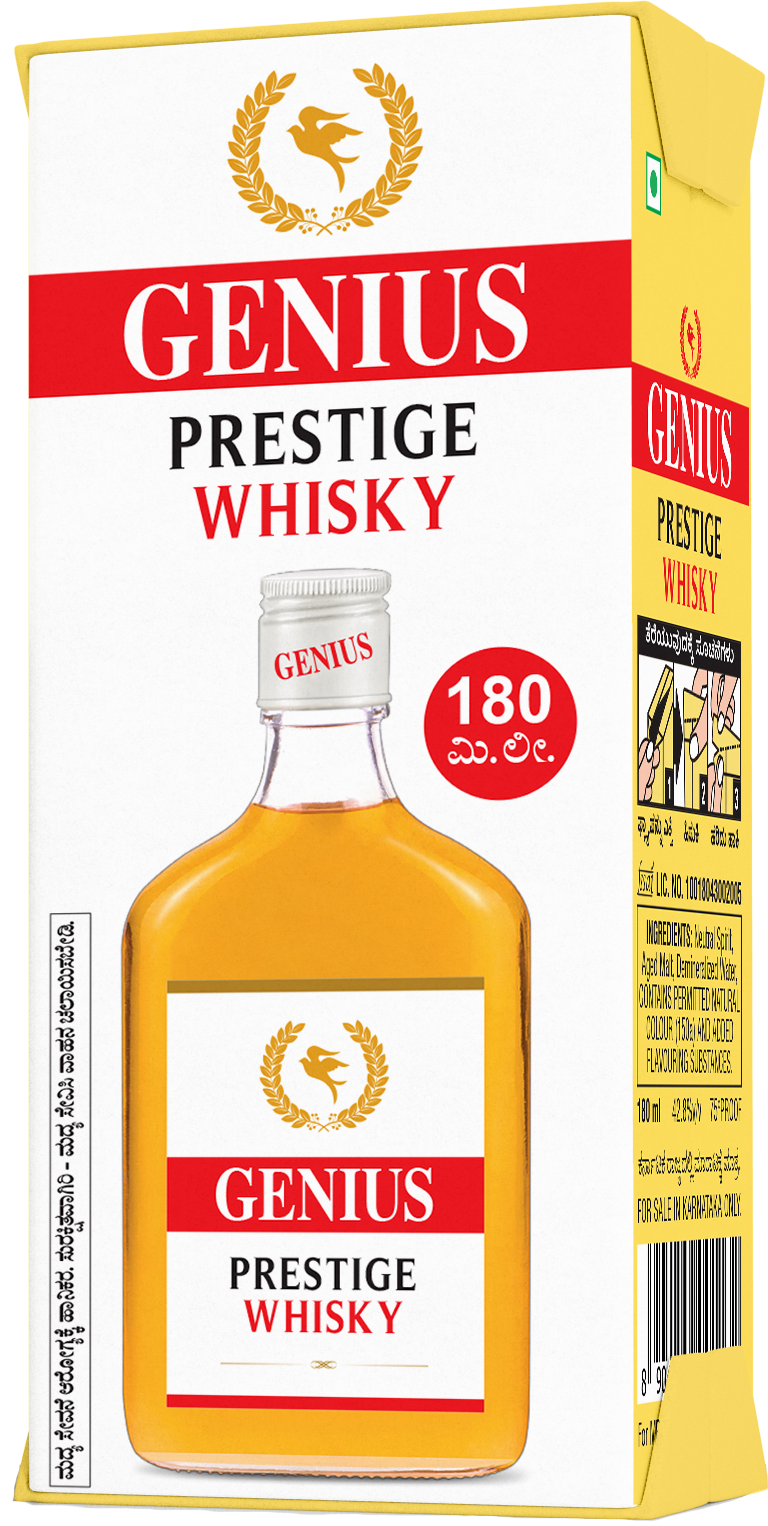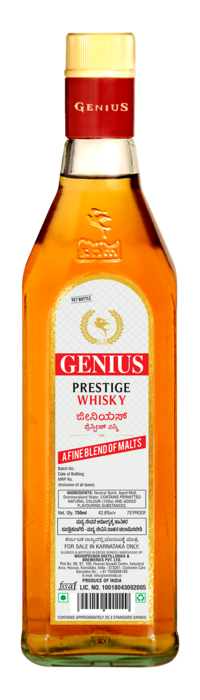 Genius Prestige whisky is a blend of finest imported scotch malts and selected Indian malt spirits. It offers a delightful pleasure in every sip. Its high malty aroma is enhanced with the earthiness of wood, making it an inspiring drink for the Indian palate. The amber liquid with shades of gold is distilled to perfection is a must to be savoured.