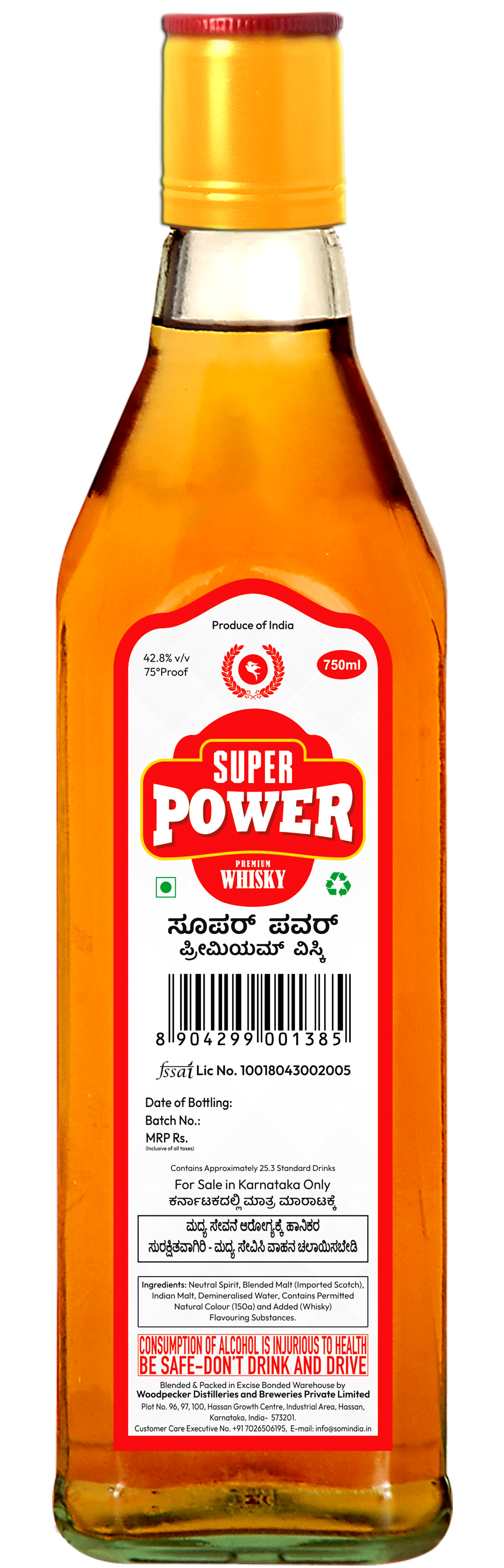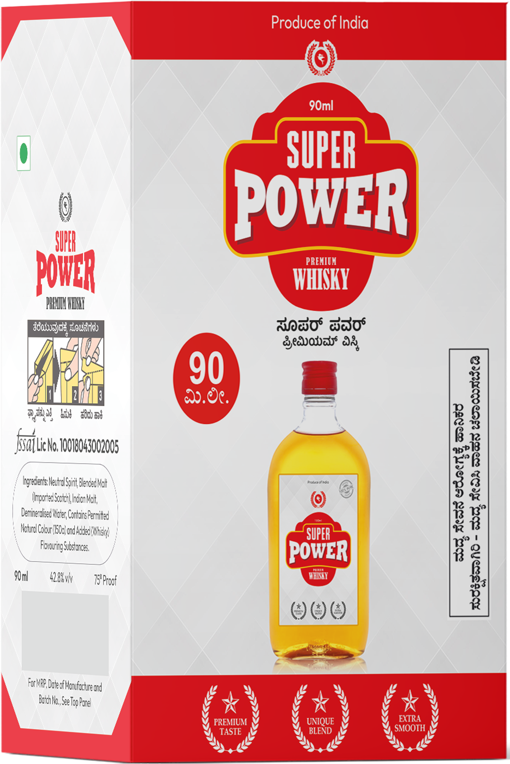 Super Power Premium Whisky is a blend of finest imported scotch malts and selected Indian malt spirits. It offers a delightful pleasure in every sip. Its high malty aroma is enhanced with the earthiness of wood, making it an inspiring drink for the Indian palate. The amber liquid with shades of gold is distilled to perfection is a must to be savoured.